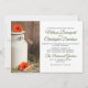 Une invitation de mariage avec un thème de mariage rustique avec un pot à lait blanc et des fleurs orange assis dans une grange sur du foin.