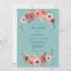 Un superbe design à l'aquarelle présente de luxuriantes compositions de pivoines pêche et d'anémones bordeaux sur un fond sarcelle tranquille. Le style pictural évoque une atmosphère romantique et fantaisiste parfaite pour un événement printanier ou estival. La verdure douce et le feuillage délicat complètent les floraisons vibrantes, créant un look équilibré et artistique pour un thème inspiré de la nature.