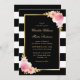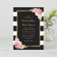 Elégante aquarelle rose vif invitation à mariage floral avec fleurs rose vif et verdure dorée sur un arrière - plan rayé noir et blanc. Éléments correspondants disponibles. Personnalisez facilement en ligne.