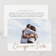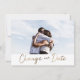 Annoncez à vos invités de mariage que votre mariage a été reporté à une date ultérieure avec ces cartes de changement de date. Avec votre photo et "change our date" en écriture dorée fausse. Personnalisez avec votre photo et les détails de votre mariage.