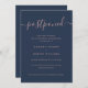 Annoncez le report de votre mariage avec cette invitation minimaliste bleu marine et rose poudré à la calligraphie moderne.