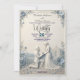 Annoncez votre histoire d'amour intemporelle avec une esthétique élégante et traditionnelle mettant en vedette une belle palette de bleu poussiéreux et de crème pour votre célébration officielle. Ce design présente une esthétique romantique classique centrée sur un motif de couple proposant magnifiquement illustré. La hiérarchie visuelle attire l'œil depuis les bordures délicates de fleurs dans les coins - composées de roses, de marguerites et de feuilles botaniques - jusqu'à un homme agenouillé avec une bague devant une femme en robe élégante. L'arrière-plan représente une chapelle classique et un chemin pavé sur fond de collines ondoyantes, le tout réalisé dans une base crème et blanc cassé avec des accents de bleu poussiéreux. La mise en page équilibre l'écriture calligraphique bleu marine formelle avec des nombres sans-serif modernes et des lettres serif classiques. Il s'agit d'une image imprimée à plat avec un