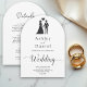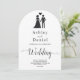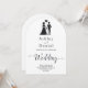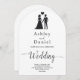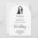 Cette élégante faire-part de mariage en arc noir et blanc est parfaite pour un mariage moderne. Le design simple présente une élégante calligraphie noire et une illustration de mariée et de mariée sur un arrière - plan blanc propre. La carte d'invitation comprend les détails du mariage au dos au lieu de payer une carte d'enceinte séparée.