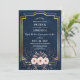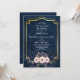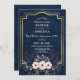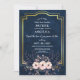 Voici la carte Marine Blue Burgundy Gold Blush Pink Wedding Invitations. Cette carte est un arrière - plan bleu marine foncé décoré d'un cadre géométrique en or imprimé, paré d'éléments floraux et verts dans les tons marine, rose, bordeaux et plus.