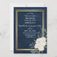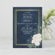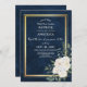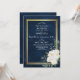 Voici la carte Marine Blue Burgundy Gold Blush Pink Wedding Invitations. Cette carte est un arrière - plan bleu marine foncé décoré d'un cadre géométrique en or imprimé, paré d'éléments floraux et verts dans les tons marine, rose, bordeaux et plus.