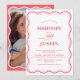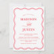 L'Invitation photo Wavy Pink Mariage combine des éléments audacieux et rétro avec une touche personnelle, avec des courbes fluides et des teintes roses et rouges vibrantes. Ce design unique met en valeur la photo de votre couple, encadrée de gribouillages ludiques et d'élégantes calligraphies, créant un parfait mélange de styles moderne et nostalgique. C'est un choix idéal pour les couples à la recherche d'une invitation personnalisée qui saisit le plaisir et l'amour de leur mariage.