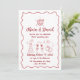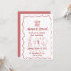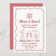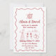 Une simple faire-part de mariage dessinée à la main avec des lignes roses et rouges, très pointues. Une boule de disco scintille en haut, et le fond présente des éléments mariages comme un gâteau à plusieurs niveaux, des verres à champagne avec des arcs et des anneaux, entourés d'une bordure ondulée ludique pour une touche vintage et élégante pour célébrer un mariage heureux.
