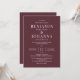 Invitation de mariage classique et élégante avec un arrière - plan rouge marron et des lettres blanches. Conception uniquement textuelle avec un libellé traditionnel. Options de papier imprimé numérique ou physique. Personnalisez-le avec les noms de M. et Mme, l'emplacement du lieu, le registre, les informations RSVP et tous les détails que vous devez inclure. Produits de suite correspondants disponibles.