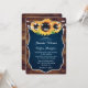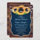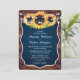 Faire-part de mariage rustique bleu marine avec tournesols et lampes à cordes contre un arrière - plan en bois de grange est parfait pour un pays bleu marine ou la fête de mariage de grange inspiré des tournesols.