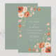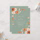 Cette création présente un fond vert olive orné de fleurs chaudes inspirées de la récolte. Des roses terracotta profondes et des ranunculus crémeux sont associés à une verdure botanique délicate. La palette de couleurs terreuses et les grappes florales artistiques évoquent une ambiance rustique sophistiquée pour un événement automnal.