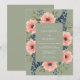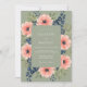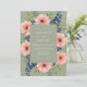 Cette conception botanique présente un fond vert sauge atténué orné d'anémones de corail vibrantes et d'accents floraux bleu marine profond. Le style pictural crée une atmosphère romantique et rustique parfaite pour un cadre extérieur ou forestier. Le feuillage luxuriant d'eucalyptus et les brindilles délicates ajoutent une touche d'élégance naturelle à la palette de couleurs.