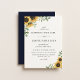 Tournesol rustique et arrangements eucalyptus, faire-part de mariage. La carte présente un design de typographie moderne et élégant. Arrière-plan couleur bleu marine.