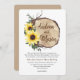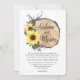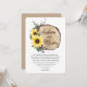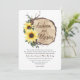 Joli faire-part de mariage d'aquarelle boho pour la fin de l'été ou l'automne avec un bouquet boisé de tournesols jaunes, cônes de pin, eucalyptus et autres branches d'aquarelle et de branches d'arbres et de rondelles avec les noms de mariés et de mariés mis en évidence au centre. Cette invitation de mariage de jardin, élégante et rustique, a un imprimé kraft brun en papier à l'envers.
