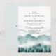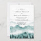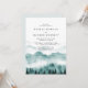 Invitation de mariage élégante et rustique avec une aquarelle de montagne avec des arbres et les initiales des mariés à l'arrière.