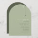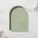 Cette élégante invitation de mariage en forme d'arche fait partie de notre collection de mariages inspirés de la nature, avec un design minimaliste dans des tons de vert sauge et de vert mousse. L'invitation présente une police de caractères sombre sur un fond de sauge, parfaite pour les couples qui recherchent une papeterie simple mais sophistiquée pour leur jour spécial. L'invitation de mariage saisissante comporte un petit accent en forme d'étoile et un modèle pour ajouter facilement les détails de votre événement. Recherchez ID1046 pour voir tous les produits de cette suite de mariage.