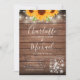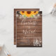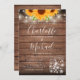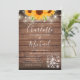 Un élégant faire-part de mariage rustique avec de jolis tournesols, des lampes à cordes, des jarres de maçon, des noms de style signature et une typographie chic sur un arrière - plan rustique en bois. Le verso présente vos initiales monographiques dans un tournesol correspondant. Conçu par Thisisnotme©