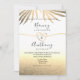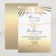 Invitation de mariage simple et élégante sur une plage de sable avec un beau cœur de corde en feuille d'or et de grandes feuilles de palmier dorées. Choix parfait pour les mariages contemporains d'été.