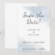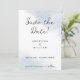 Cette simple carte de Save the Date pour un mariage minimaliste sur la plage présente des polices de caractères classiques et modernes sur un fond aquarelle abstrait bleu poussiéreux et blanc inspiré de l'océan. Vous pouvez facilement personnaliser cette invitation "Save the Date" pour un mariage sur l'océan avec vos propres détails en utilisant ce design sur le thème de l'océan et cette palette de couleurs côtières. C'est polyvalent et peut être utilisé pour correspondre à de nombreuses idées et décorations de mariage sur le thème de la plage. Ces invitations de mariage minimalistes et élégantes sur la plage conviennent aux mariages tropicaux ainsi qu'aux mariages nautiques dans des climats plus frais. Parfait pour les couples qui aiment la mer (ou les peintures aquarelles artistiques modernes !).