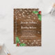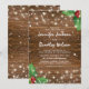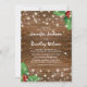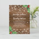 Cartes d'invitation de mariage de Noël country rustique avec un fond en bois sombre, du houx festif, des flocons de neige et des guirlandes lumineuses.