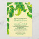 Cartes d'invitation de mariage sur le thème des feuilles d'or Tropicana. Les noms des mariés sont en écriture verte. Le reste du texte est d'un vert plus foncé. Ces invitations sont très chic et élégantes et feront une impression durable sur vos invités.
