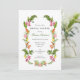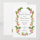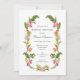 Invitation de mariage tropical élégant à l'aquarelle peinte à la main, encadrée par un arrangement délicat de verdure tropicale luxuriante colorée et de fleurs roses et orange.