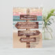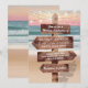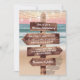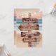 Cartes d'invitation de mariage romantique sur l'océan avec une plage de sable luxuriante au coucher du soleil, des guirlandes lumineuses et votre texte écrit sur un panneau indicateur en bois rustique.