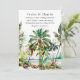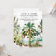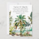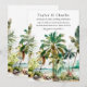 Cette élégante et belle invitation de mariage à l'aquarelle présente une plage et des palmiers. Le texte combine une écriture manuscrite et des polices sans empattement pour un look stylé et moderne. C'est parfait pour un mariage d'été sur la plage ou une destination tropicale.
