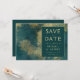 Cette élégante carte Save the Date présente un arrière - plan d'aquarelle turquoise moderne, bleu et or. Customisez le texte de couleur or dans des polices de style sur un rectangle turquoise foncé, puis ajoutez l'URL de votre site Web mariage au dos turquoise solide.