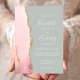 Le bord gauche de cette élégante faire-part de mariage moderne est orné d'une bordure en aquarelle rose vif et recouverte d'une parties scintillant en faux or. Le texte personnalisable combine écriture manuscrite, copperplate et polices italiques en blanc sur un arrière - plan vert sauge pâle. L'envers est assorti d'un design d'agate en blush et or.