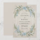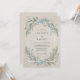 Cette création présente une palette d'aquarelle douce de bleu ciel et de vert sauge sur un fond de parchemin texturé. Des delphiniums délicats et une verdure d'eucalyptus luxuriante créent une atmosphère romantique et botanique. Le style pictural évoque une esthétique sereine et vintage parfaite pour un événement en plein air au printemps ou en été.