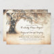 Le faire-part de mariage rustique vintage est orné d'un chêne sculpté ancien et de lampes à cordes.