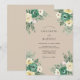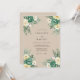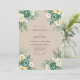 Ce design présente un fond chaud et chamois orné de roses sarcelles luxuriantes et crème. De délicates brindilles d'eucalyptus et de feuillage vert accentuent les coins, créant une esthétique organique et romantique. Les textures d'aquarelle et les tons terreux atténués évoquent une ambiance vintage sophistiquée pour une cérémonie en forêt.