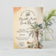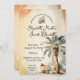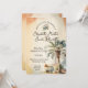 Elégante invitation de mariage aquarelle dans des tons vintages moody avec un grand palmier, signe et lunettes de soleil.