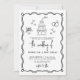 Ce faire-part de mariage unique et fantaisiste est parfait pour les couples qui souhaitent ajouter une touche ludique et créative à leur grand jour. Conçu en noir et blanc classique, il a le charme d'un chef-d'oeuvre griffé à la main, comme si joliment dessiné avec des notes manuscrites. La pièce maîtresse de la conception est un cadre ondulé attaché avec un petit arc doux en haut, enrobant vos détails mariages dans un mélange de script et de polices manuscrites pour un toucher amusant et personnel. Autour du texte sont des illustrations exquises et délicieuses, dont des anneaux mariages, un gâteau à plusieurs niveaux, des coeurs, une tour de champagne, des fleurs et une voiture "Just Married". Ces créations funky et ces gribouillis de style croquis donnent à l'invitation une ambiance branchée et insouciante tout en restant élégante. Le dos ajoute une touche extra personnelle avec un joli monogramme écrit à la main des initiales du couple encadrées par de minuscules coeurs. Entièrement personnalisable, ce design est parfait pour les couples modernes qui veulent quelque chose de léger, de design et de personnalité. Célébrez votre histoire d'amour avec ce faire-part de mariage amusant et artistique! Disponible en version imprimée ou en invitation numérique téléchargeable.