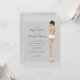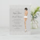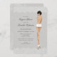 L'invitation à la douche nuptiale Lingerie présente la mariée pour être dans ses sous-vêtements avec un arrière - plan en dentelle. Plusieurs options sont disponibles pour les cheveux de la mariée et le ton de la peau. Le dos de l'invitation comporte des soutien-gorge et des culottes avec des tailles.
