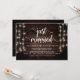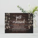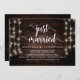 Mariés à peine, Carte d'annonce / invitation de fuite de noces, en Bois de ferme rustique, conception de guirlandes lumineuses. C'est parfait pour votre réception de mariage et fête de célébration après le mariage. Ajoutez vos détails dans la police / lettrage correspondant.