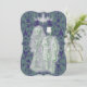 Couple de mariés squelettes effrayants et charmants qui brillent. Caractéristiques de design de style vintage avec lustre et arrière-plan orné. Le couple se promène main dans la main. Cette invitation Halloween convient bien aux bals costumés, cocktails, soirée Halloween et mariage d'Halloween. Caractéristiques bleu sarcelle, blancs, noir et violet.