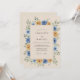 This design features a rich palette of marigold yellow and dusty blue watercolor blossoms. Lush greenery and sage-colored foliage accent the romantic arrangement against a warm sand-colored background. Beautifully detailed roses and ranunculus create a sophisticated rustic aesthetic for a seasonal event.