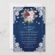 Faire-part de mariage floral rustique avec des fleurs bordeaux et rousses/roses sur un arrière - plan en bois de grange bleu orné de dentelle fleurie blanche et de lampes à cordes. Un design de carte parfait pour inviter vos invités à votre mariage rustique bleu marine et bordeaux. Éléments correspondants disponibles.
