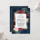 Le design comprend un arrière - plan en plinthe en bois bleu marine décoré d'une élégante couronne fleurie fleurie de pivoines roses, de la verdure d'eucalyptus et plus dans les tons bordeaux, rouge de Marsala, marron, rose roux, etc. Le design présente également une bordure imprimée couleur or sous la couronne fleurie pour un look moderne.