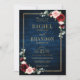 Faire-part de mariage à double face géométrique bleu marine foncé bordeaux avec élégant bouquet bleu marine, bleu royal, blanc, roux, bordeaux, rose marsala et vert sauge eucalyptus feuilles et élégant cadre géométrique neutre parties scintillant or. Veuillez me contacter pour toute aide sur la personnalisation ou si vous avez besoin d'un autre produit avec ce design.
