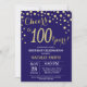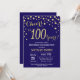 Invitation du 100e anniversaire avec l'Arrière - plan Diamond Parties scintillant bleu et or de la Marine. Confetti d'or. Anniversaire adulte. Hommes ou Femmes Anniversaire. Pour plus de personnalisation, cliquez sur le bouton "Customiser" et utilisez notre outil de conception pour modifier ce modèle.
