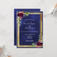 Une faire-part de mariage moderne et tendance. Un arrière - plan bleu foncé, bleu marine. La couleur bleue est inégale. Avec un cadre en faux or et des fleurs bordeaux aquarelles, des fleurs verdoyantes. Modèles pour vos noms et informations de cérémonie. Les noms sont écrits avec un script de style moderne écrit à la main. Retour : arrière - plan bleu.