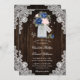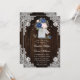 Faire-part de mariage rustique à fleurs bleu marine et rousse avec un bouquet de roses bleus et bleus, souffle et verdure pour bébé à l'intérieur d'un bocal de maçon contre un arrière - plan en bois de grange orné de dentelle fleurie blanche et de lumières scintillantes. Un design de carte parfait pour inviter vos invités à votre fête de mariage campagnard bleu marine et rustique.