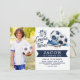 Moderne, tendance sportive et dynamique photo soccer / football invitation anniversaire de enfant, parfait pour les jeunes amateurs de football. Le design propose un script de typographie "son temps de jeu", une illustration aquarelle avec un ballon de football et des chaussures dans des couleurs bleues tendance, une photo et des détails de la fête en lettres gras tendance. Avec des fonctionnalités modifiables, vous pouvez personnaliser l'invitation sans effort avec le nom de votre enfant et les détails de la fête.