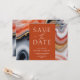 Contemporain enregistrez l'invitation de date avec un carré orange dans lequel toutes vos informations sont élégamment écrites sur un arrière - plan abstrait en marbre d'agate. Les détails de l'agate sont dans les tons orange et bleu avec des accents dorés. Consultez notre magasin pour plus d'articles de cette collection mariage.