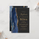 Le bord gauche de cette élégante invitation à la fête d'anniversaire moderne comporte une bordure en aquarelle bleu marine ornée d'une fausse parties scintillant dorée. Le texte personnalisable combine écriture manuscrite dorée, cuivre et polices italiques sur un arrière - plan noir ardoise. L'envers est assorti d'un design d'agate bleu marine et or.