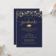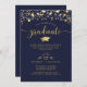 Élégante invitation de la fête de graduation bleu marine et or avec typographie de script de calligraphie branchée et faux bouchon de graduation de feuille d'or métallique ou mortier et diplômes avec une bordure de confettis, étoiles et lumières à cordes contre une couleur arrière - plan modifiable vous pouvez changer à une couleur d'école ou de couleur préférée. ASSISTANCE : Pour obtenir de l'aide sur la modification ou la personnalisation de la conception, le changement de couleur, le transfert de la conception vers un autre produit ou pour coordonner des éléments, contactez le concepteur AVANT DE COMMANDER via l'onglet MESSAGE Conversation Zazzle ou envoyez un courriel à makeitaboutyoustore@gmail.com.
