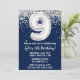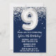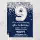 Marine bleu et argent 9e anniversaire invitation à la fête à l'âge de 9 ans invitation avec noir blanc argent avec écriture de script moderne et ballon amusant.