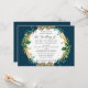 "Marine Gold Pine Cone Green Faire-part de mariage." Mise en page horizontale de 5 po x 7 po. Un riche arrière - plan bleu marine découvre l'élégante et moderne verdure d'aquarelle avec des cônes de pin, des feuilles de feuillage, des feuilles saints et des baies avec parties scintillant d'or. Il y a aussi un éclaboussure doré doux qui est répété à l'envers. L'oeuvre d'aquarelle a été créée par Audrey Jeanne Roberts, artiste de renommée internationale. Droit d'auteur .